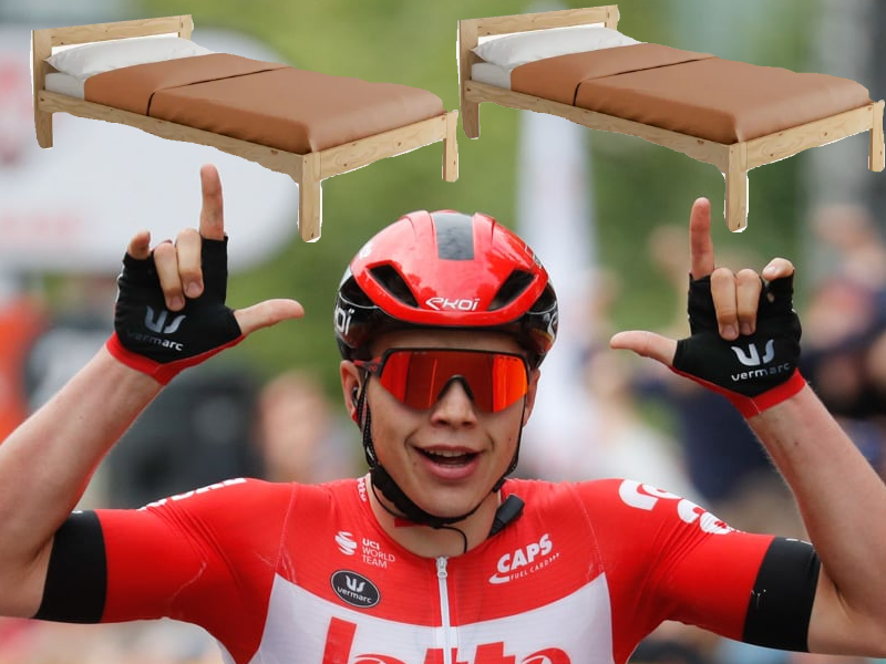 | velo cyclisme arnaud de lie two beds lotto soudal roglic remco pogacar wout | ||