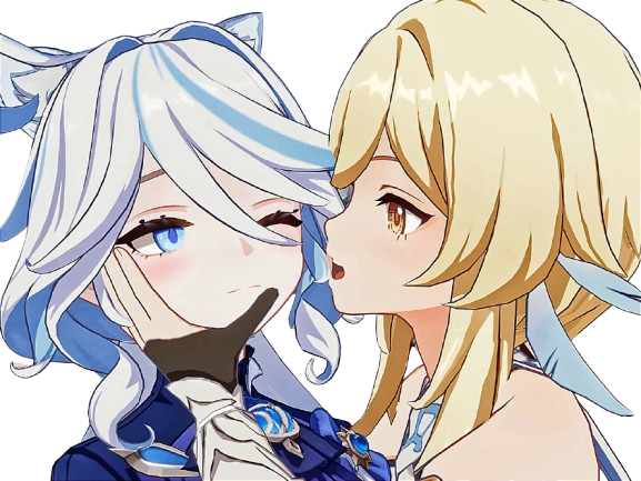 | genshin furina focalors lumine voyageuse tabibito traveler lesbienne yuri amour couple bisou embrasser | ||