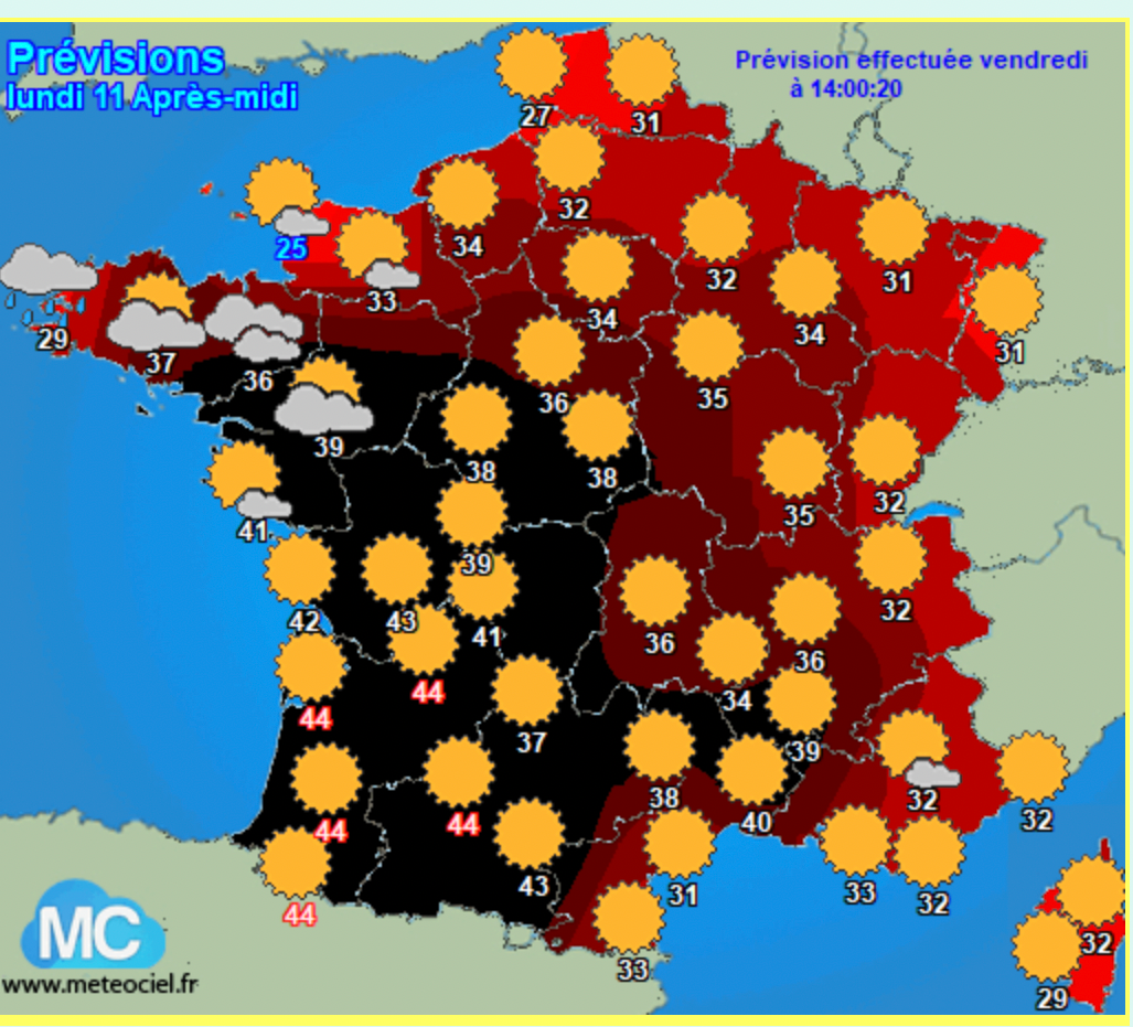 | canicule meteo plan carte map soleil chaleur temperature 40 degres chaud ete rechauffement climat | ||