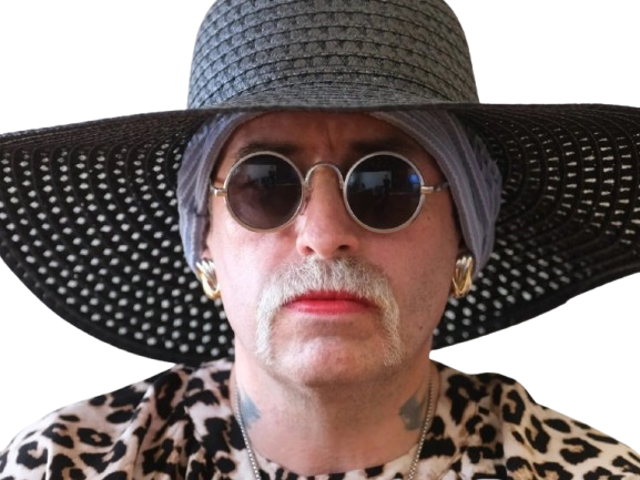 | moustache lunettes homme chapeau leopard rouge a levres trans transgenre knifos | ||