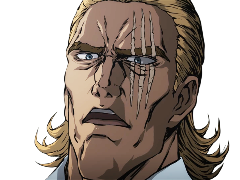 | king heros one punch man opm balafre geek otaku cheveuxblonds yeuxbleus manga anime classe s | ||