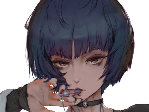 | tae takemi persona 5 p5 jeu video rpg medecin punk gothique femme cheveux bleus fonces yeux marrons blouse blanche waifu | ||