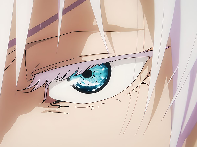 | satoru gojo exorciste professeur classe s jujutsu kaisen jjk anime manga homme le plus fort sans bandeau cheveux blancs yeux bleus | ||