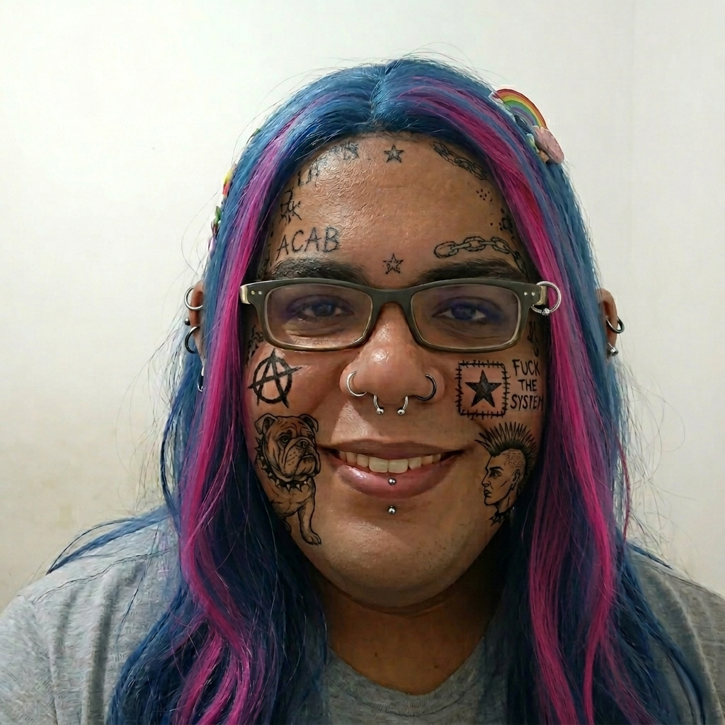| giuseppe gepetto woke monstre umd tatouages piercings acab cheveux bleus lgbt gauchiste trans | ||